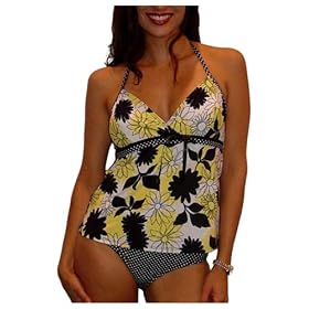 Modern, graphic daisy print Tummy Thinner¿ empire halter tankini with ribbon trim and dot panty. Pattern mix top with dot bottom hides and camouflages the tummy area. I.f.¿ is a division of It Figures!¿ swimwear. "This is swimwear created by women, for women, helping women's bodies in more ways than one"